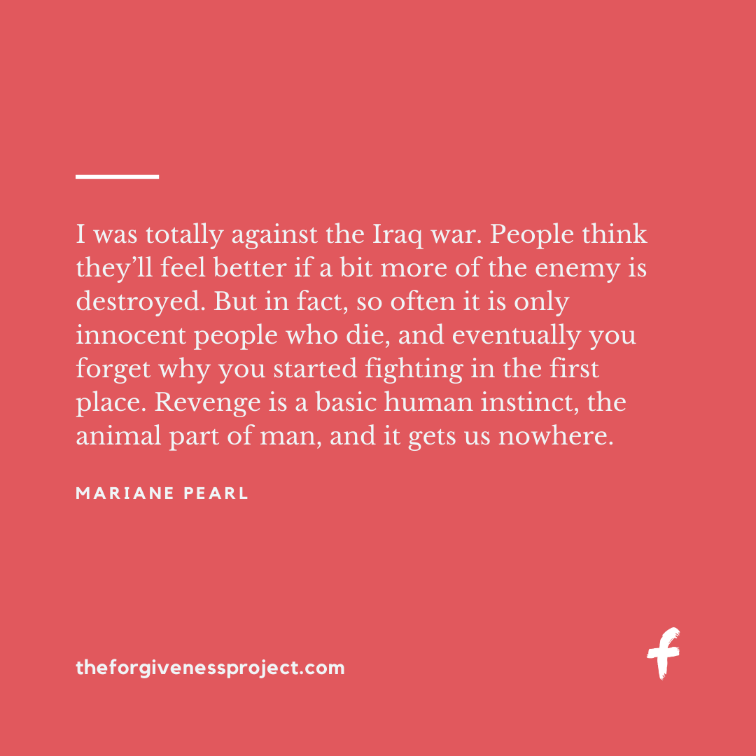 “I was totally against the Iraq war. People think they’ll feel better if a bit more of the enemy is destroyed. But in fact, so often it is only innocent people who die, and eventually you forget why you started fighting in the first place. Revenge is a basic human instinct, the animal part of man, and it gets us nowhere.” - Mariane Pearl