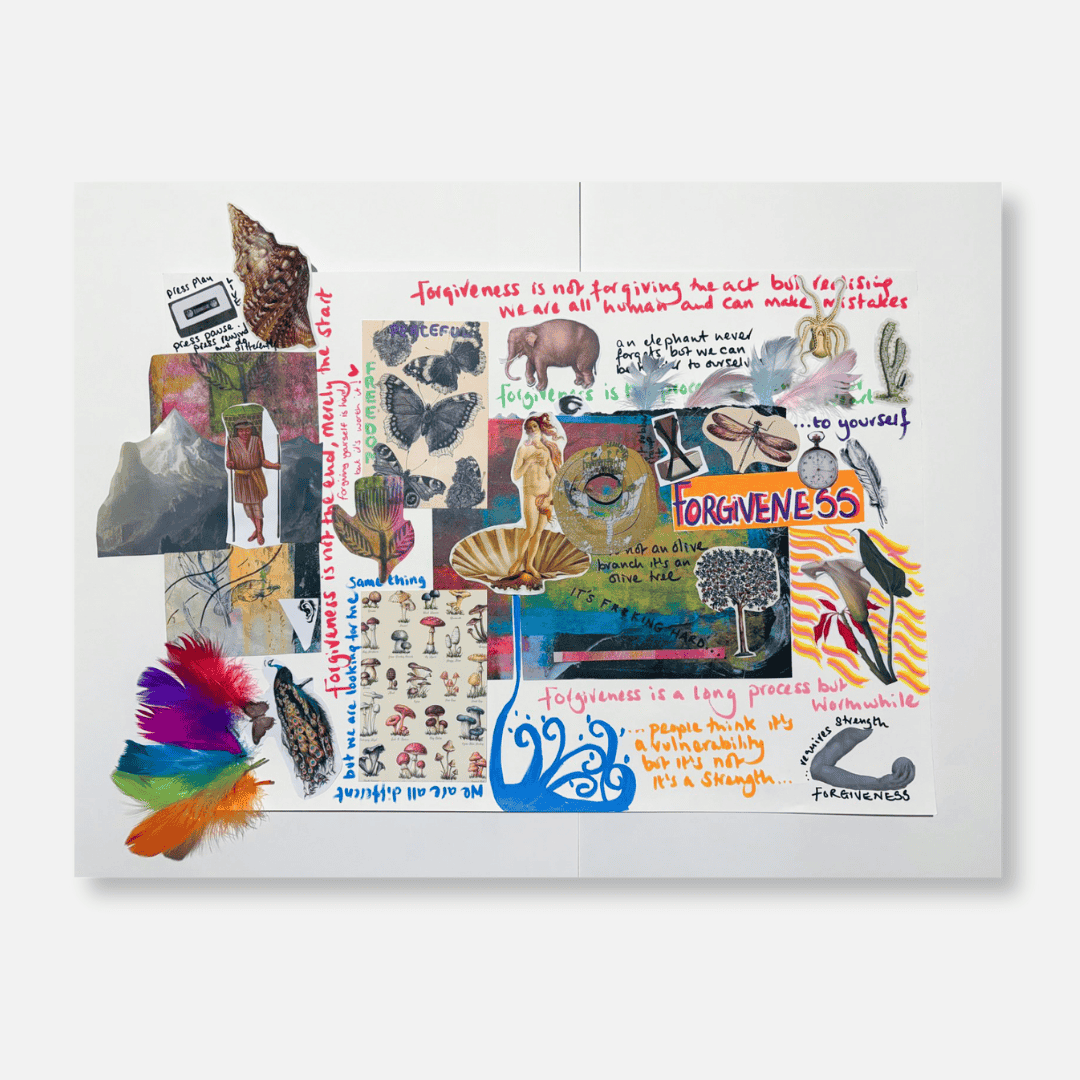 ‘In November 2025 we commenced a new funded opportunity to explore five Forgiveness Café’s with women who have attended our RESTORE programmes in the NEXUS Unit, at HMP Eastwood Park. We decided to begin these cafes exploring collective collaging to bring forth conversations in a different way. These collages are from two cafes we have led to date and represent the diverse thoughts, feelings, textures and images that represent these conversations.